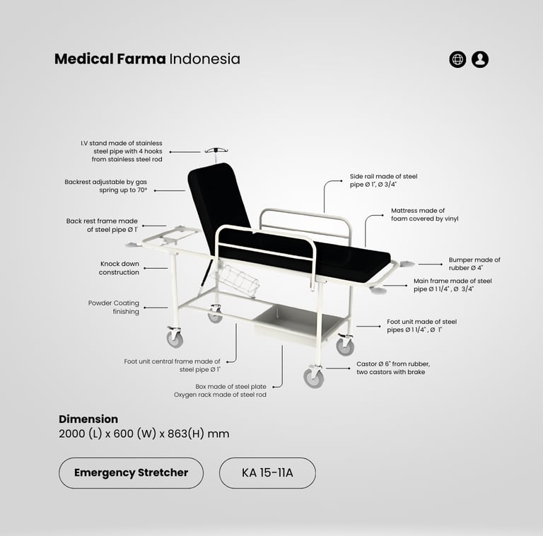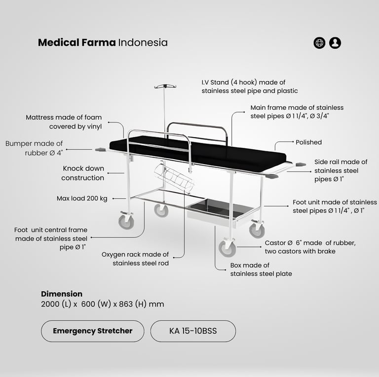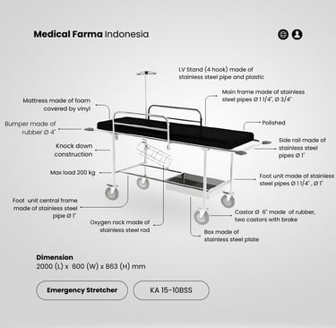 Brankar rumah sakit emergency stretcher stainless steel dari Medical Farma Indonesia. Dirancang untuk penggunaan darurat dengan konstruksi kokoh dan fitur lengkap.