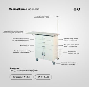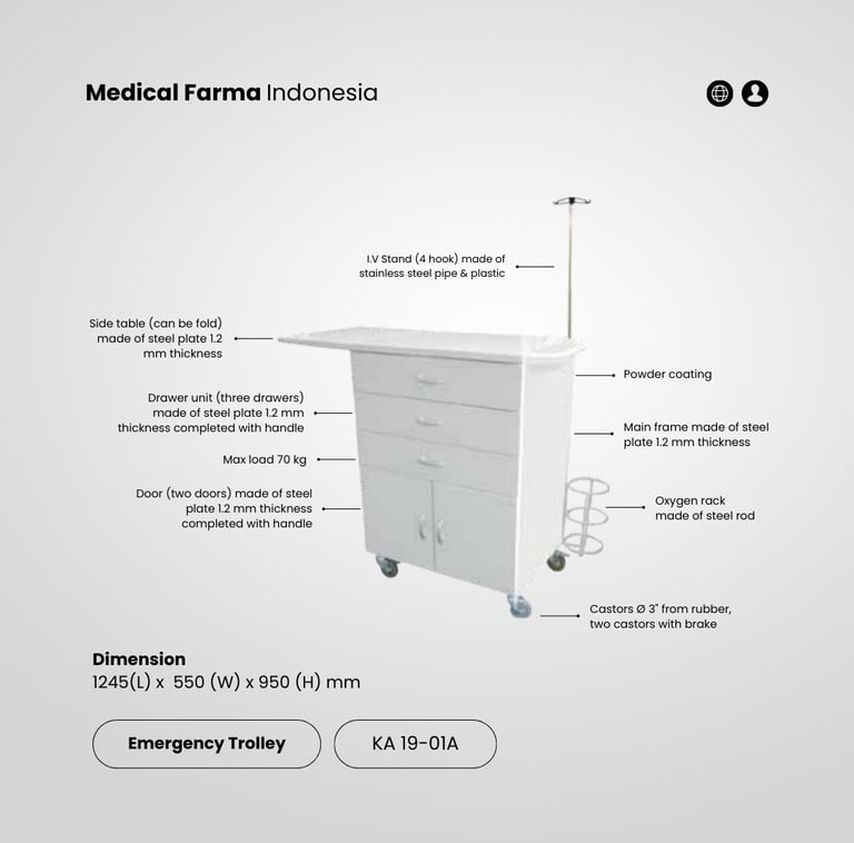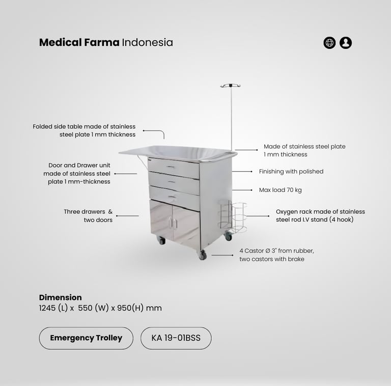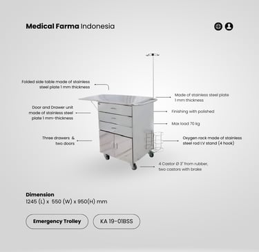 Troli emergency ini sangat ideal untuk rumah sakit, klinik, puskesmas, dan fasilitas kesehatan lainnya. Dengan desain multifungsi, Anda dapat menyimpan dan mengorganisir berbagai peralatan medis dengan rapi. Konstruksi stainless steel menjamin daya tahan dan higienis.