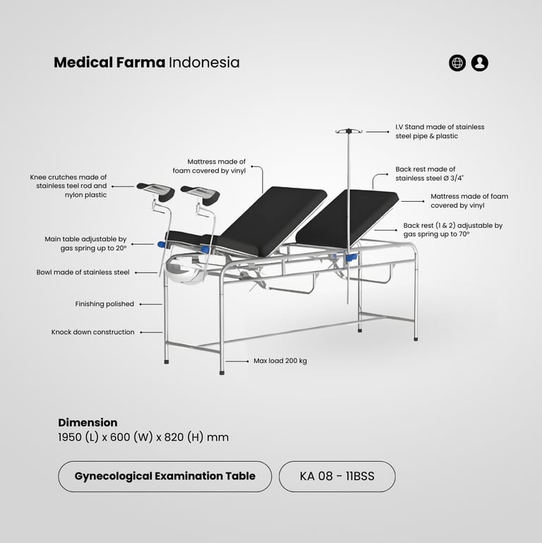 KA 08-11BSS: Berupa meja pemeriksaan statis dengan rangka stainless steel poles dan sistem knock-down.